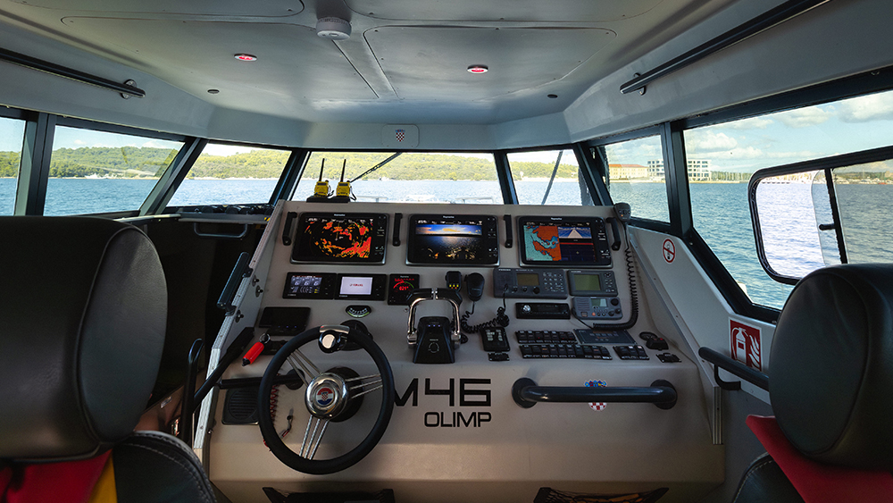 The vessel is equipped with two (2) seats positioned side by side for the pilot and co-pilot, and two (2) additional seats located behind them. These seats are fitted with specialized shock-absorbing mounts for vibration damping to ensure crew safety and comfort during operations in adverse sea conditions.