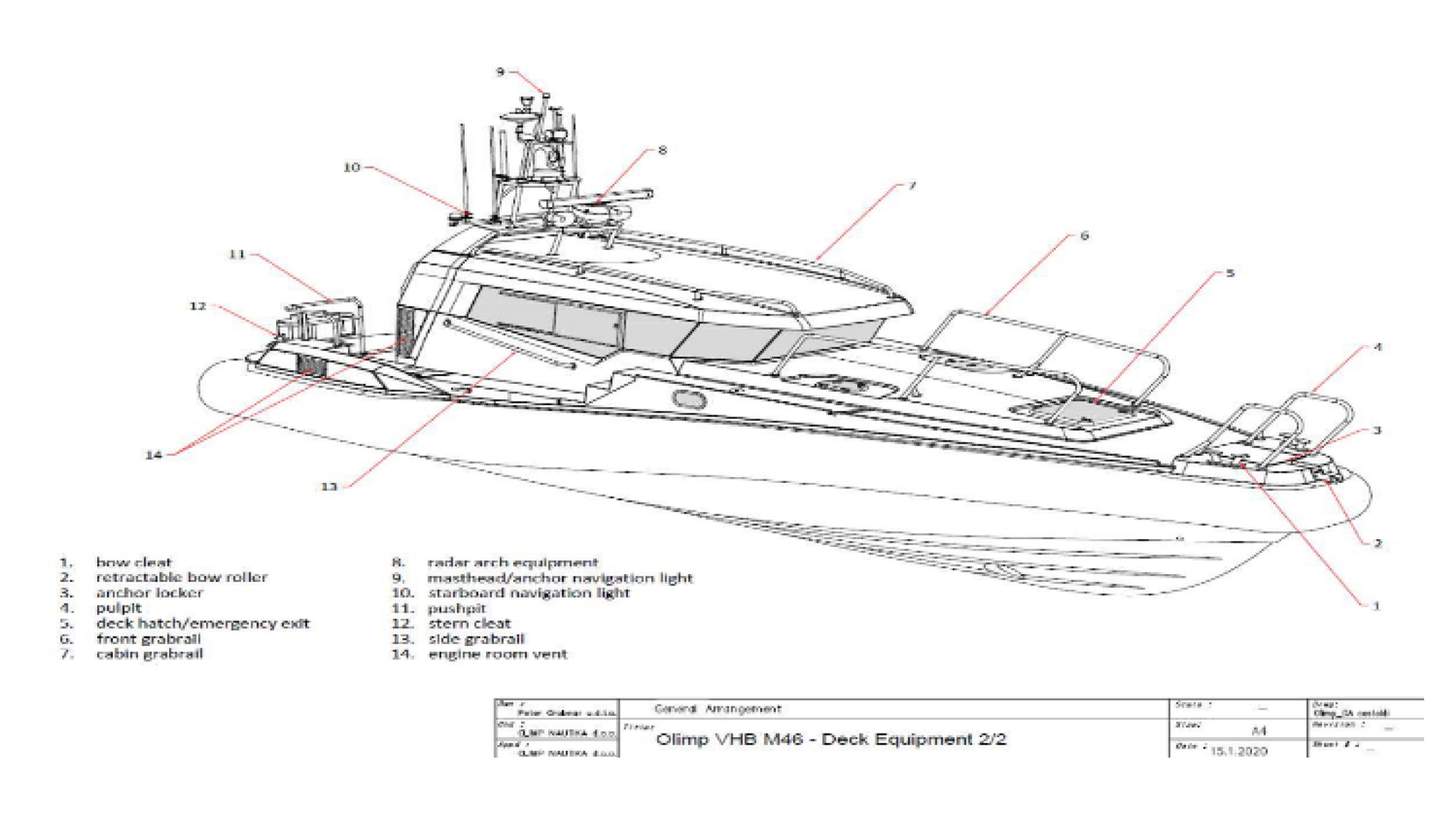 Eye bolts are installed on the deck in appropriately balanced and reinforced positions for attaching lifting straps when hauling or hoisting the boat by crane at full load. Their placement ensures that they do not hinder the movement of personnel on board.